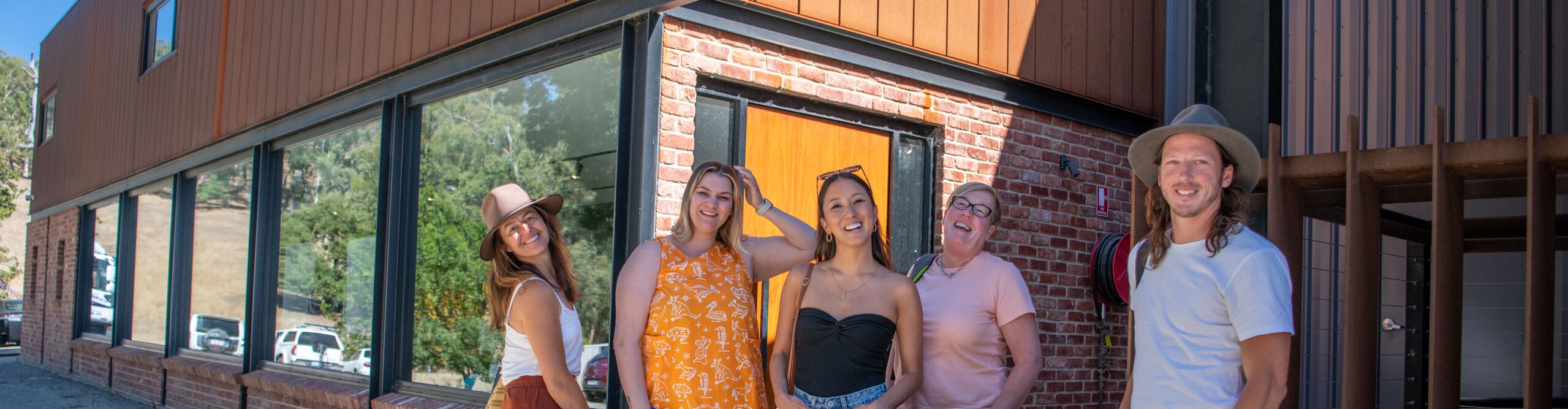 A group of five people smile and pose outside a gin distillery in the Adelaide Hills