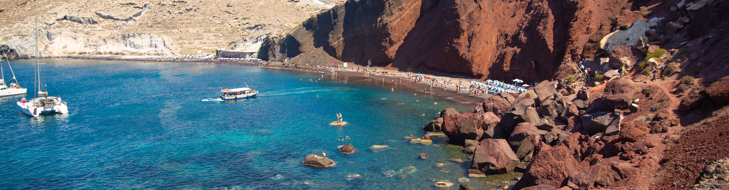 Santorini ticks all the boxes: volcanic coastlines, iconic blue-domed buildings, great shopping and seaside dining. But the biggest drawcard? To-die-for views. After sailing around the Cyclades, consider sticking around to hike the caldera rim – where cliffs plunge into the Aegean – or relax on black-sand beaches.