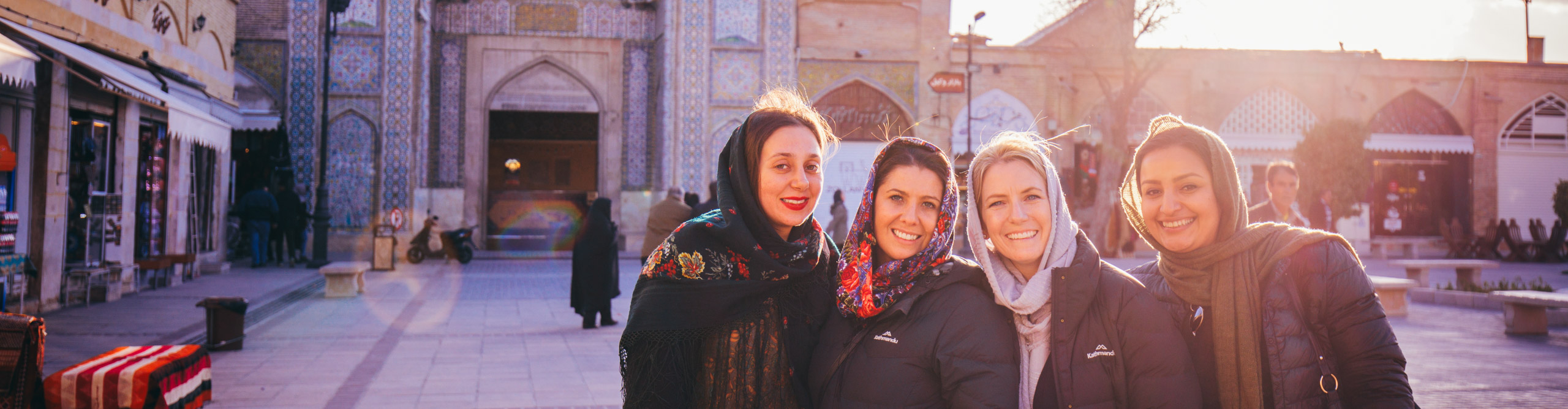 For women smiling at camera standing in the market square in Iran