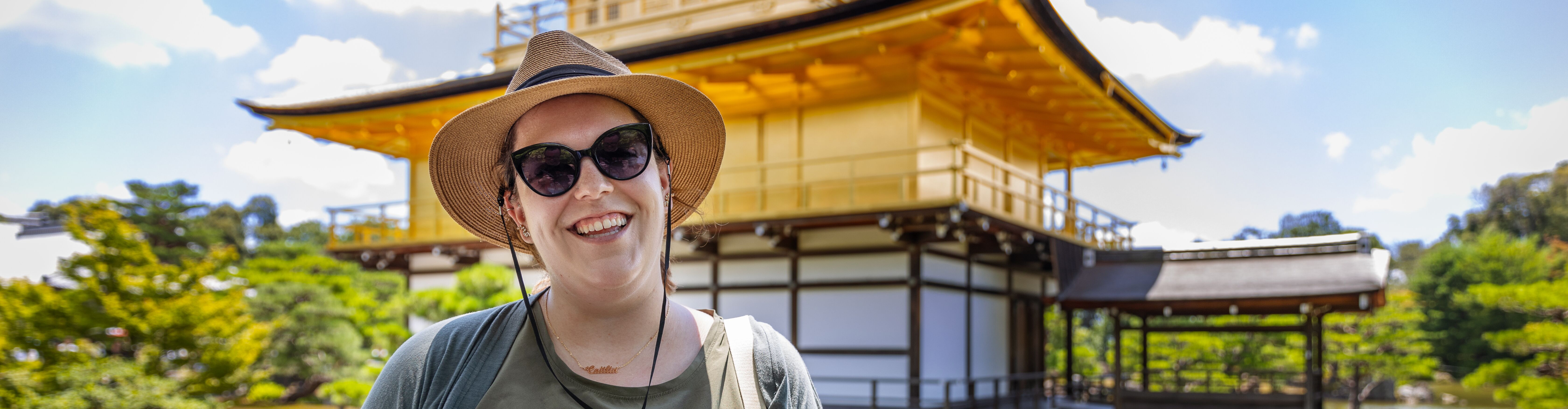 A local Intrepid leader smiling and waving standing on a historic street in Kyoto, Japan.