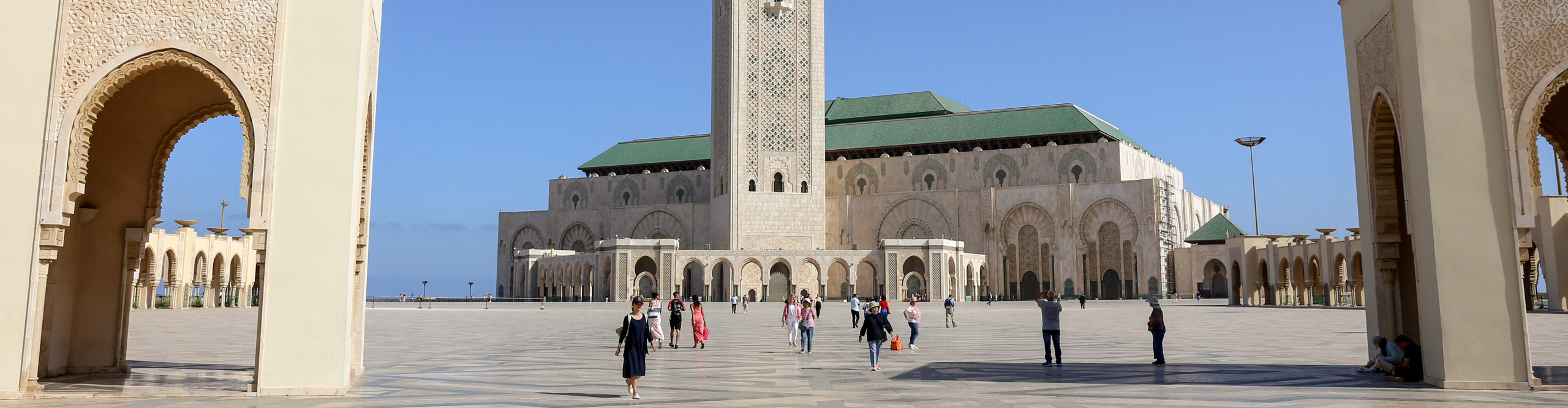 People walking outside the Hassan Mosque, with a clear blue sky, in Casablanca, Morocco