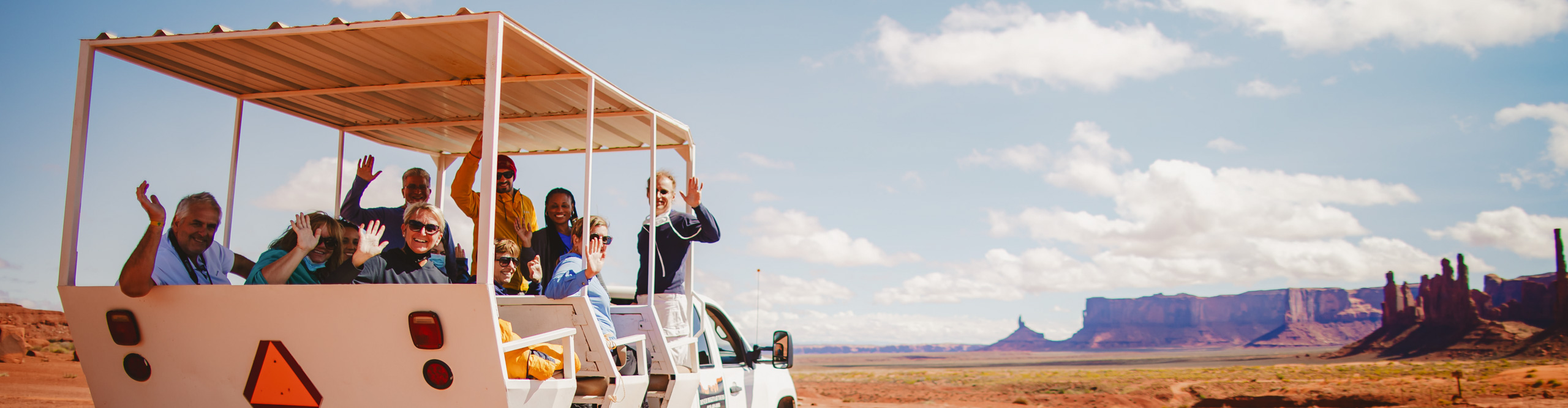 Group on truck waving at camera in Monument Valley, on a sunny day with a few clouds, Arizona, USA